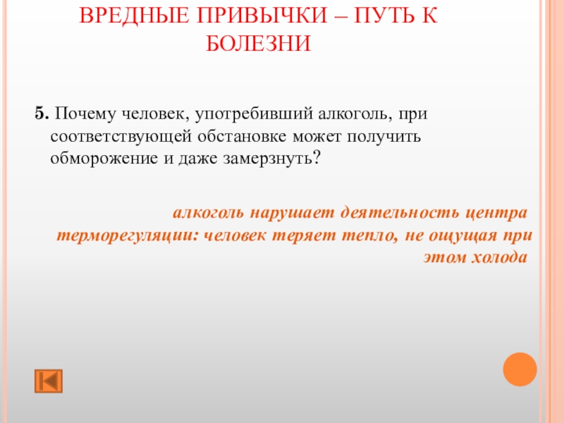 ВРЕДНЫЕ ПРИВЫЧКИ – ПУТЬ К БОЛЕЗНИ 5. Почему человек, употребивший алкоголь, при соответствующей обстановке может получить обморожение