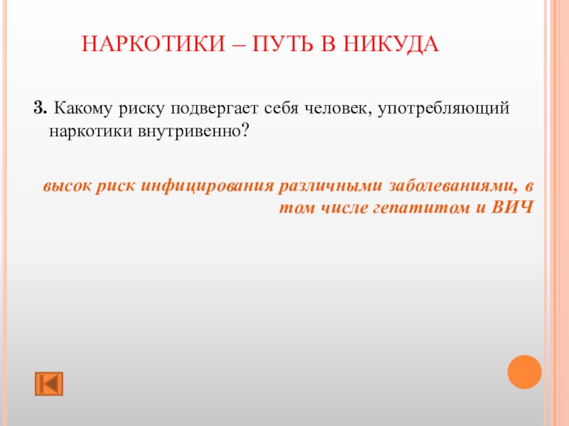 НАРКОТИКИ – ПУТЬ В НИКУДА 3. Какому риску подвергает себя человек, употребляющий наркотики внутривенно? высок риск инфицирования