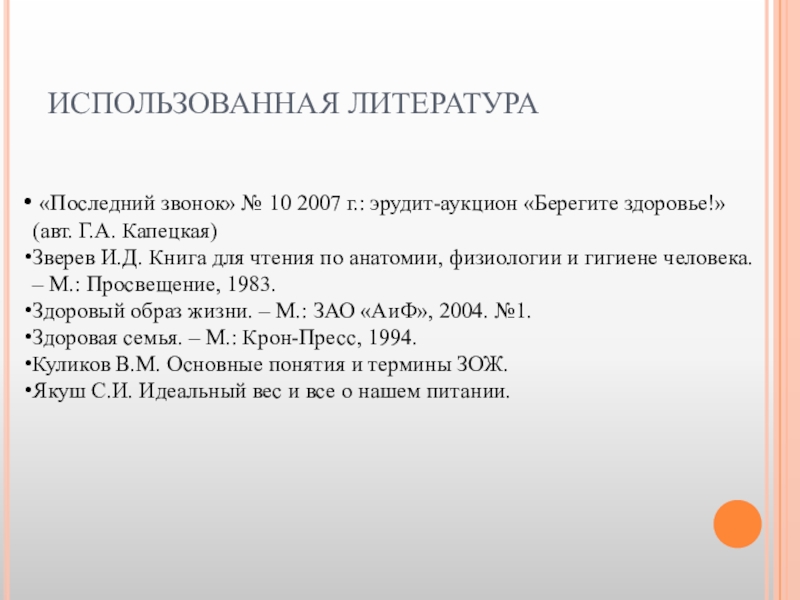 ИСПОЛЬЗОВАННАЯ ЛИТЕРАТУРА «Последний звонок» № 10 2007 г.: эрудит-аукцион «Берегите здоровье!» (авт. Г.А. Капецкая)Зверев И.Д. Книга для
