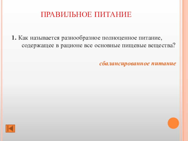 ПРАВИЛЬНОЕ ПИТАНИЕ 1. Как называется разнообразное полноценное питание, содержащее в рационе все основные пищевые вещества? сбалансированное питание
