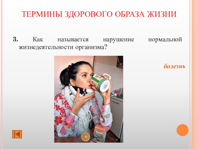 ТЕРМИНЫ ЗДОРОВОГО ОБРАЗА ЖИЗНИ 3. Как называется нарушение нормальной жизнедеятельности организма? болезнь