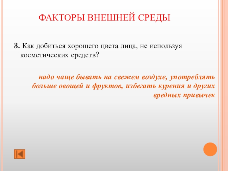ФАКТОРЫ ВНЕШНЕЙ СРЕДЫ 3. Как добиться хорошего цвета лица, не используя косметических средств? надо чаще бывать на