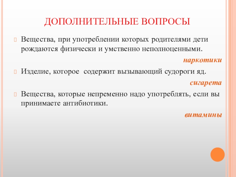 ДОПОЛНИТЕЛЬНЫЕ ВОПРОСЫВещества, при употреблении которых родителями дети рождаются физически и умственно неполноценными.