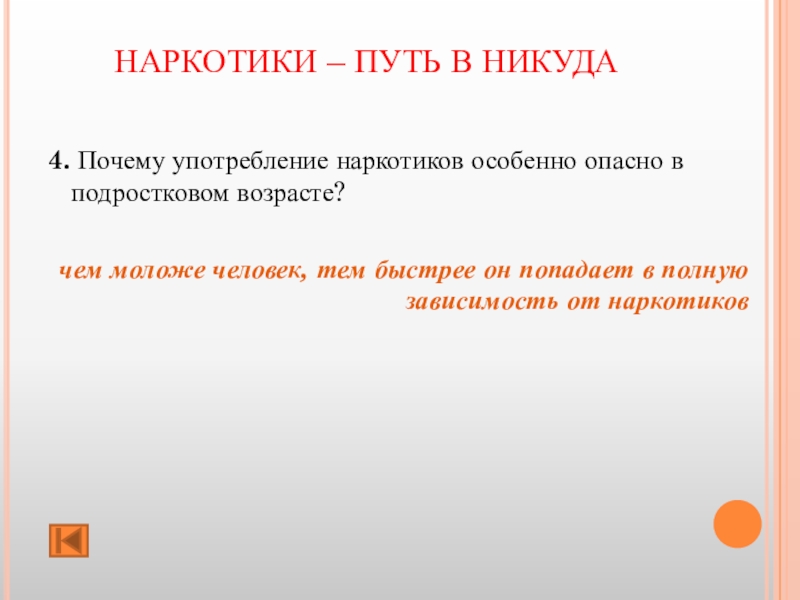 НАРКОТИКИ – ПУТЬ В НИКУДА 4. Почему употребление наркотиков особенно опасно в подростковом возрасте? чем моложе человек,