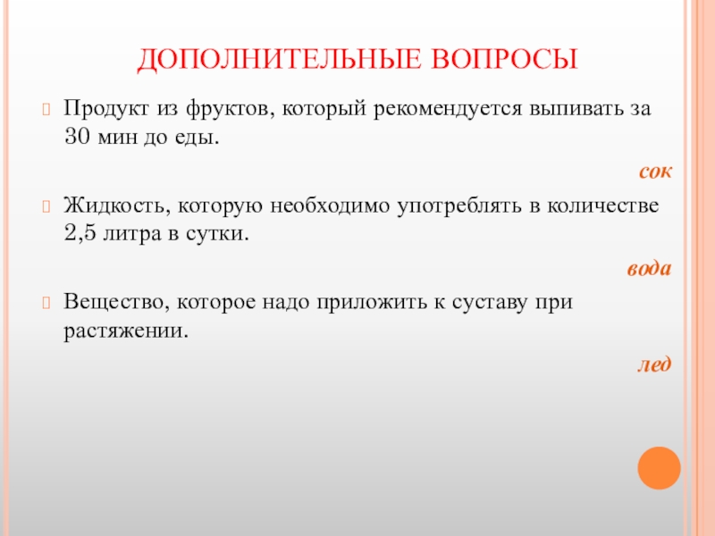 ДОПОЛНИТЕЛЬНЫЕ ВОПРОСЫПродукт из фруктов, который рекомендуется выпивать за 30 мин до еды.