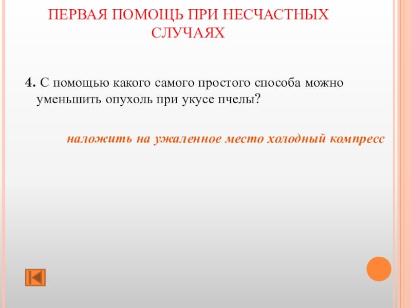 ПЕРВАЯ ПОМОЩЬ ПРИ НЕСЧАСТНЫХ СЛУЧАЯХ 4. С помощью какого самого простого способа можно уменьшить опухоль при укусе