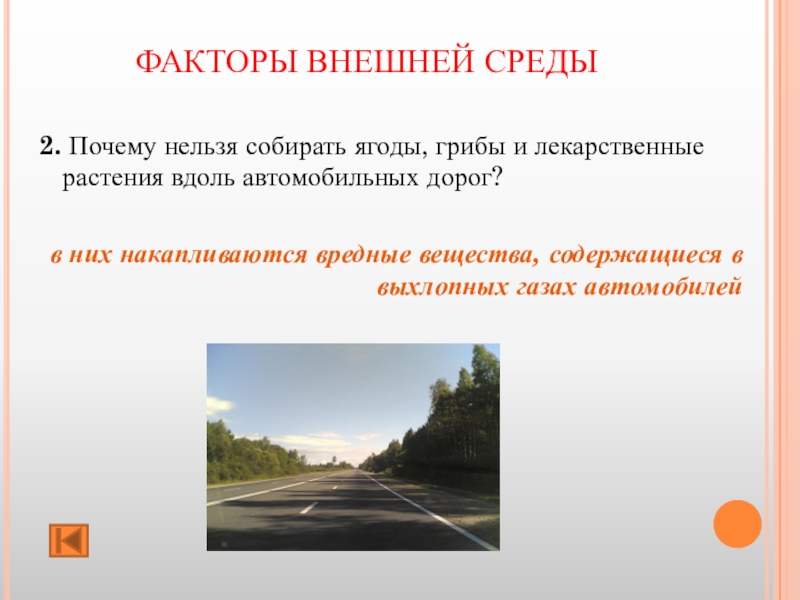 ФАКТОРЫ ВНЕШНЕЙ СРЕДЫ 2. Почему нельзя собирать ягоды, грибы и лекарственные растения вдоль автомобильных дорог? в них