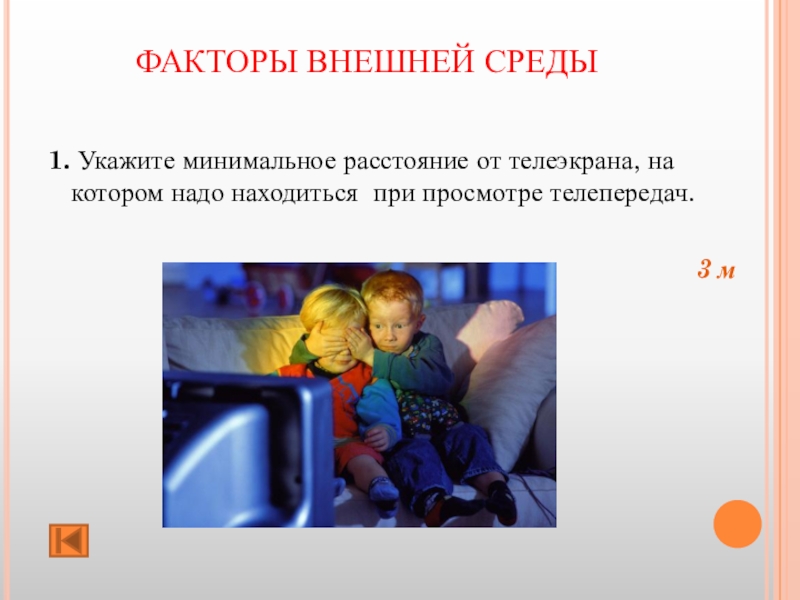 ФАКТОРЫ ВНЕШНЕЙ СРЕДЫ 1. Укажите минимальное расстояние от телеэкрана, на котором надо находиться при просмотре телепередач. 3