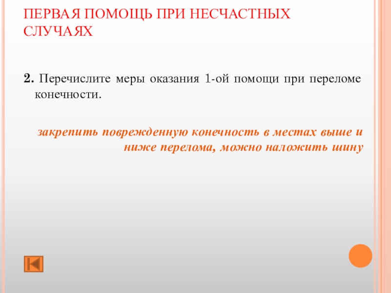 ПЕРВАЯ ПОМОЩЬ ПРИ НЕСЧАСТНЫХ СЛУЧАЯХ 2. Перечислите меры оказания 1-ой помощи при переломе конечности. закрепить поврежденную конечность