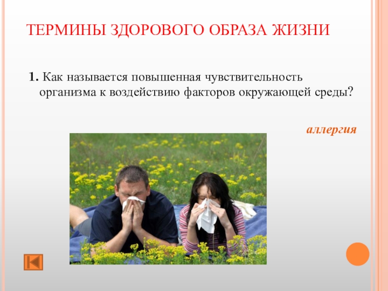 ТЕРМИНЫ ЗДОРОВОГО ОБРАЗА ЖИЗНИ 1. Как называется повышенная чувствительность организма к воздействию факторов окружающей среды?  аллергия