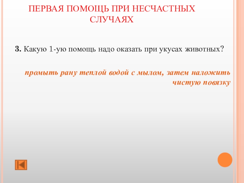 ПЕРВАЯ ПОМОЩЬ ПРИ НЕСЧАСТНЫХ СЛУЧАЯХ 3. Какую 1-ую помощь надо оказать при укусах животных? промыть рану теплой