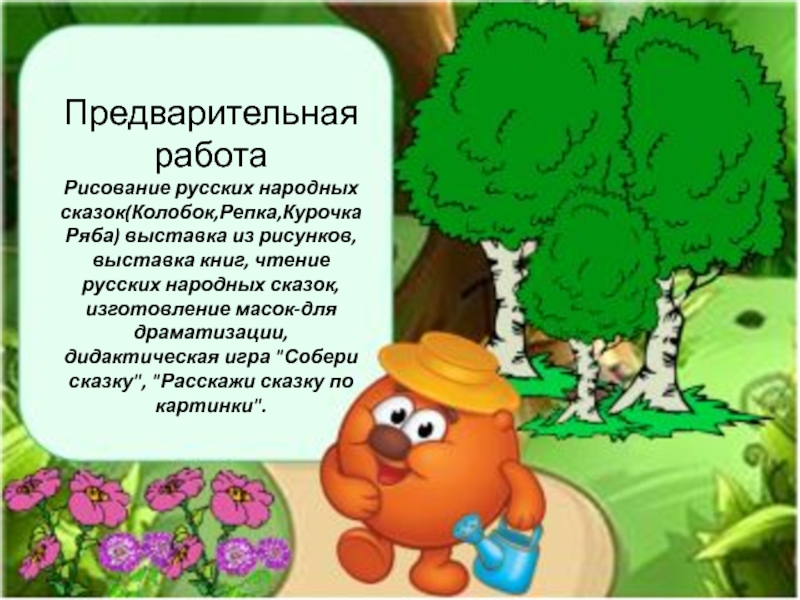 Предварительная работаРисование русских народных сказок(Колобок,Репка,Курочка Ряба) выставка из рисунков, выставка книг, чтение русских народных сказок, изготовление масок-для