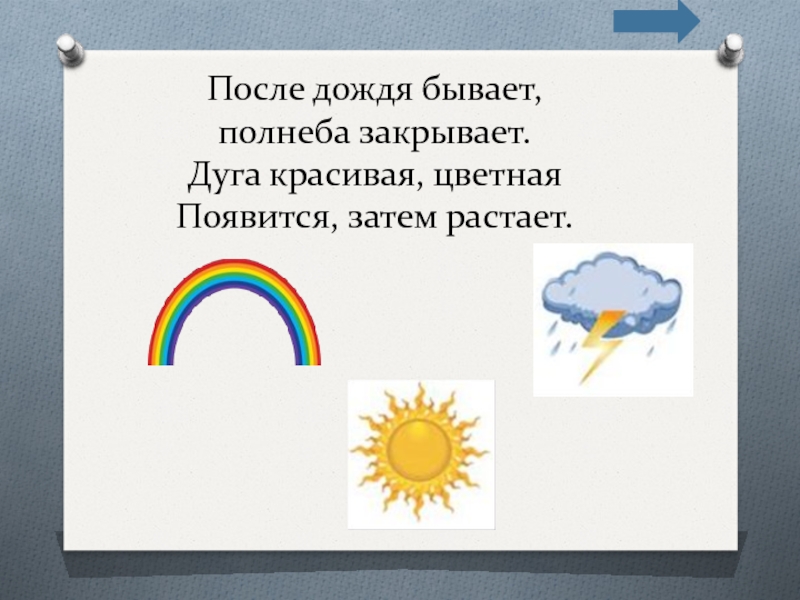 Слайд 2После дождя бывает, полнеба закрывает. Дуга красивая, цветная Появится, затем растает.