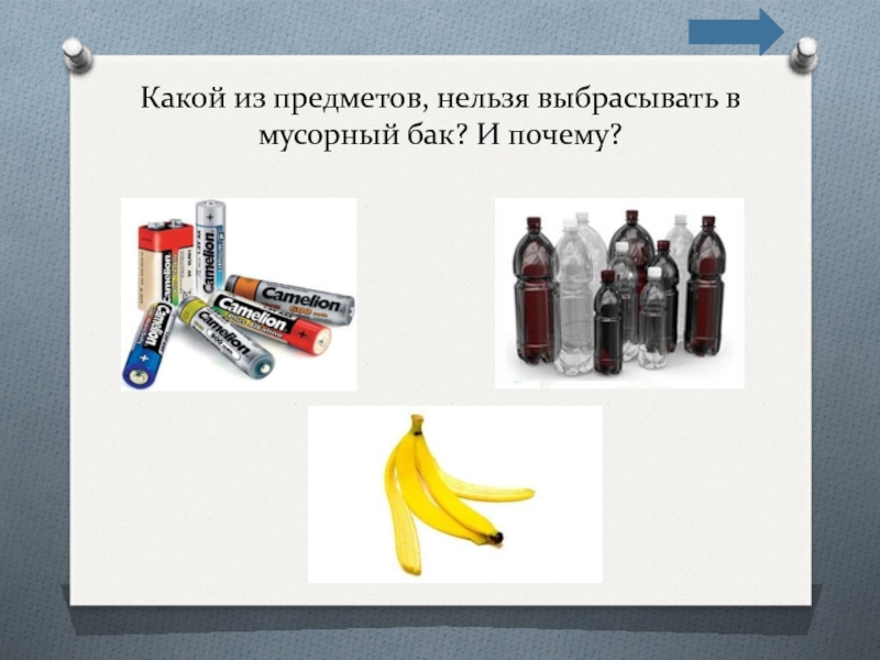 Слайд 29Какой из предметов, нельзя выбрасывать в мусорный бак? И почему?