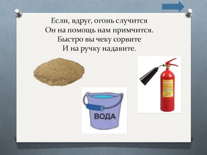 Если, вдруг, огонь случится  Он на помощь нам примчится.  Быстро вы чеку сорвите  И