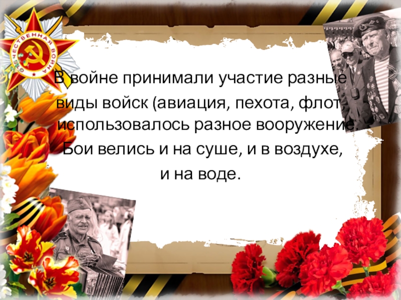 В войне принимали участие разные виды войск (авиация, пехота, флот, использовалось разное вооружение. Бои велись и на