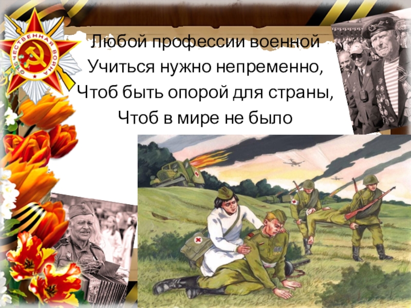 Любой профессии военнойУчиться нужно непременно,Чтоб быть опорой для страны,Чтоб в мире не было