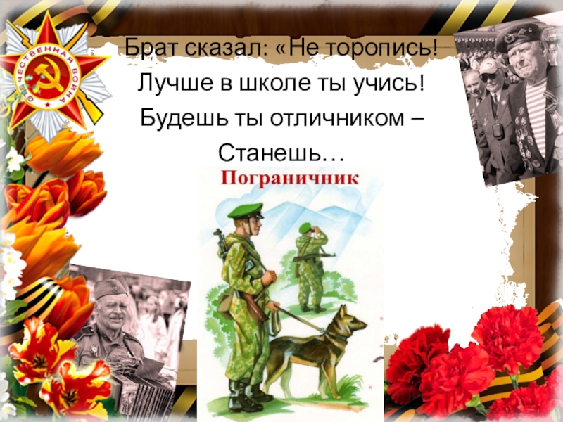 Подрасту и вслед за братомТоже буду я солдатом,Буду помогать емуОхранять свою….