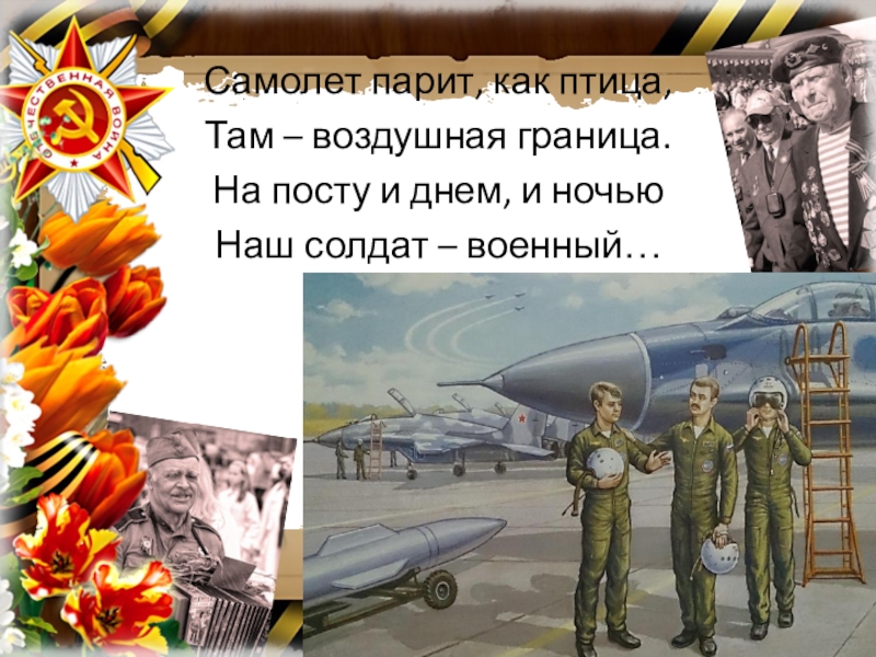 Самолет парит, как птица,Там – воздушная граница.На посту и днем, и ночьюНаш солдат – военный…