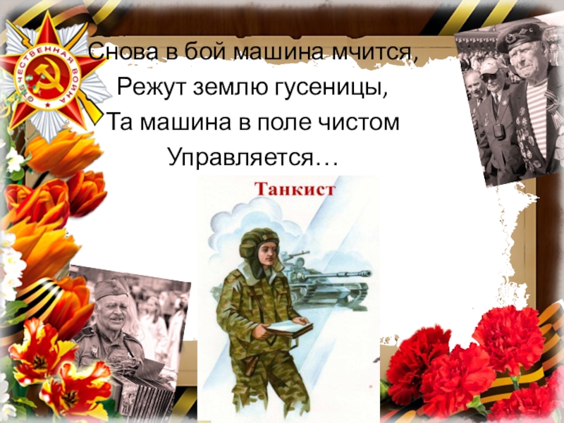 Снова в бой машина мчится,Режут землю гусеницы,Та машина в поле чистомУправляется…