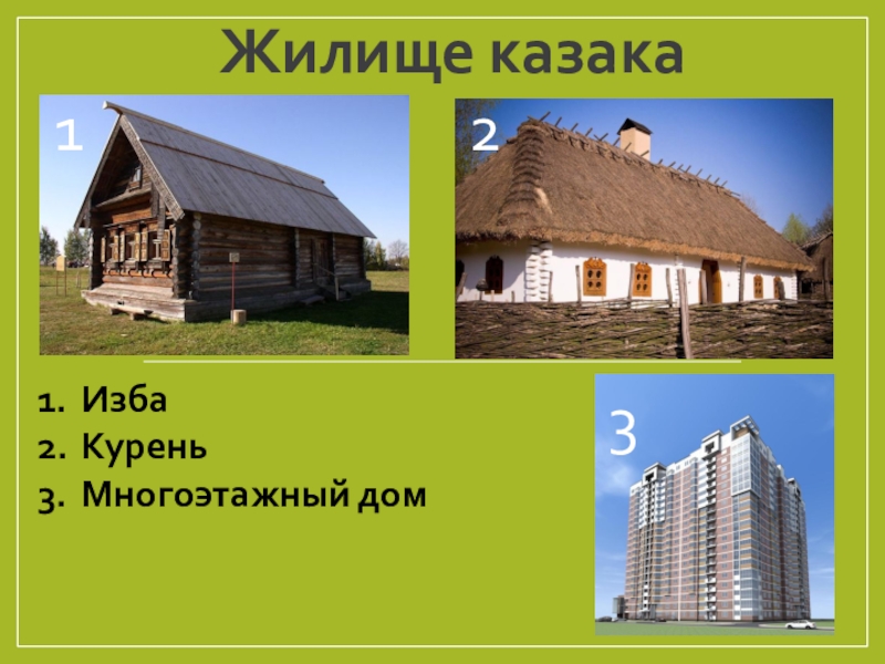 Жилище казакаИзбаКуреньМногоэтажный дом123