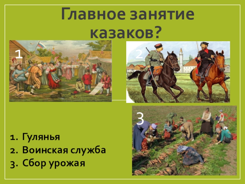 Главное занятие казаков?12ГуляньяВоинская службаСбор урожая3