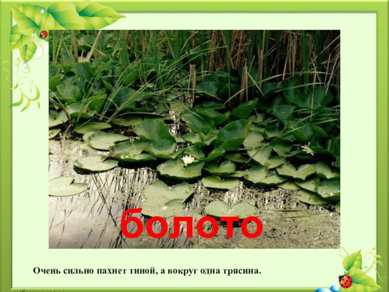 Слайд 26Очень сильно пахнет тиной, а вокруг одна трясина.