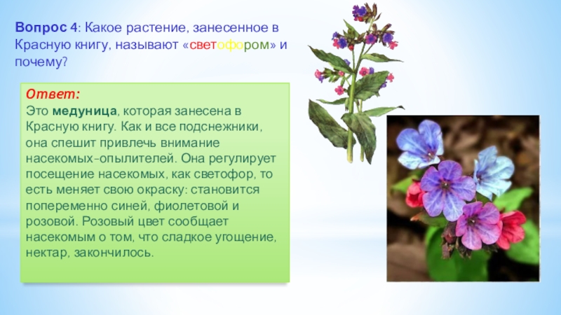 Это медуница, которая занесена в Красную книгу. Как и все подснежники, она спешит привлечь внимание насекомых-опылителей. Она регулирует посещение насекомых, как светофор, то есть меняет свою окраску: становится попеременно синей, фиолетовой и розовой. Розовый цвет сообщает насекомым о том, что сладкое угощение, нектар, закончилось.