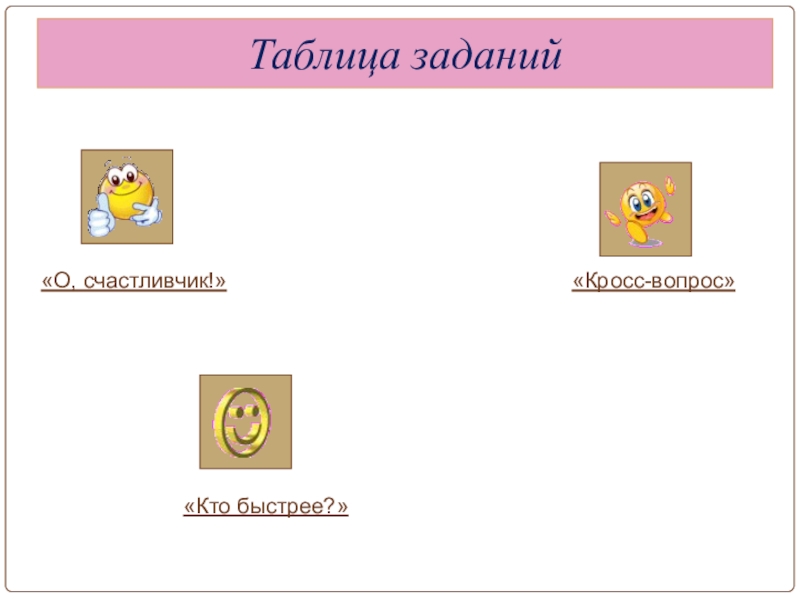 «Кто быстрее?» «Кросс-вопрос»«О, счастливчик!»Таблица заданий