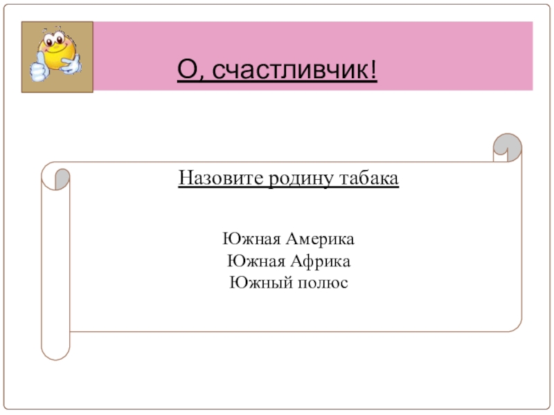 О, счастливчик!Назовите родину табака Южная Америка Южная АфрикаЮжный полюс
