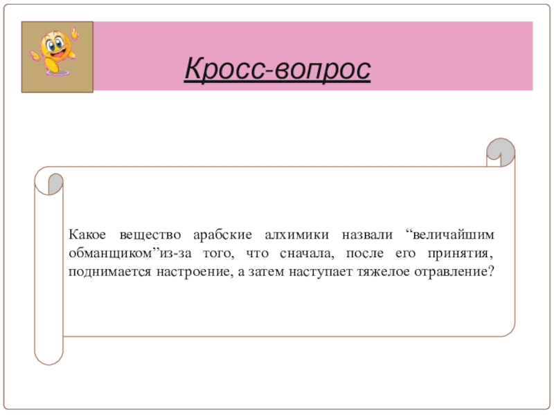 Кросс-вопросКакое вещество арабские алхимики назвали “величайшим обманщиком”из-за того, что сначала, после его принятия, поднимается настроение, а затем