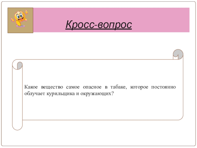 Кросс-вопросКакое вещество самое опасное в табаке, которое постоянно облучает курильщика и окружающих?