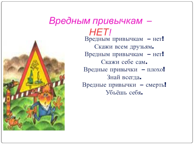 Вредным привычкам – НЕТ! Вредным привычкам – нет! Скажи всем друзьям.Вредным привычкам – нет! Скажи себе сам.Вредные