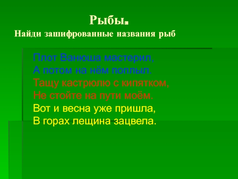 Плот Ванюша мастерил, А потом на нём поплыл. Тащу кастрюлю с кипятком, Не стойте на пути моём. Вот и весна уже пришла, В горах лещина зацвела.