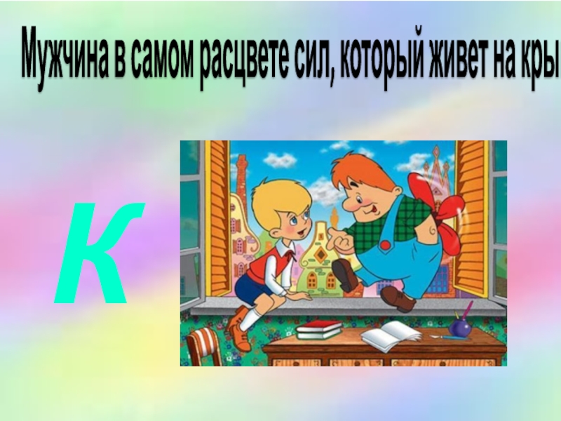 Слайд 20Мужчина в самом расцвете сил, который живет на крыше.