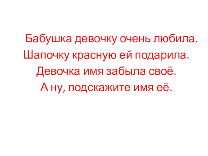 Бабушка девочку очень любила.Шапочку красную ей подарила.Девочка имя забыла своё.А ну, подскажите имя её.