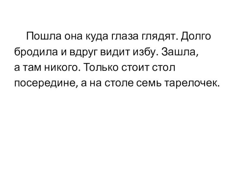 Пошла она куда глаза глядят. Долго  бродила и вдруг видит избу. Зашла,а там никого. Только стоит