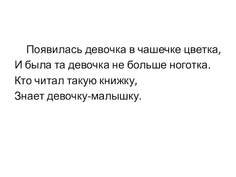 Появилась девочка в чашечке цветка,И была та девочка не больше ноготка.Кто читал такую книжку,Знает девочку-малышку.