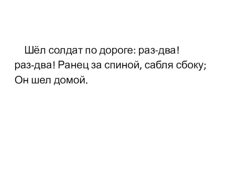Шёл солдат по дороге: раз-два!раз-два! Ранец за спиной, сабля сбоку;Он шел домой.