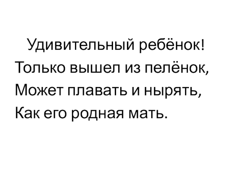 Удивительный ребёнок!Только вышел из пелёнок,Может плавать и нырять,Как его родная мать.