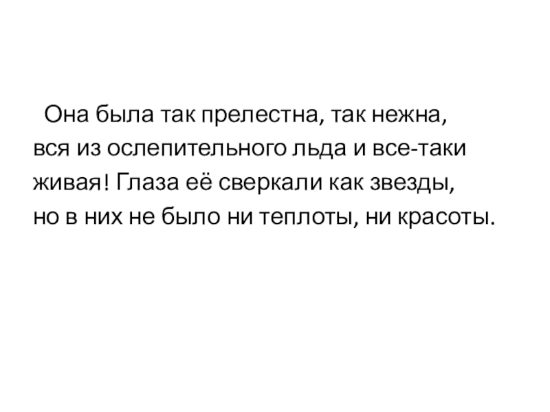 Она была так прелестна, так нежна,вся из ослепительного льда и все-такиживая! Глаза её сверкали как звезды,но