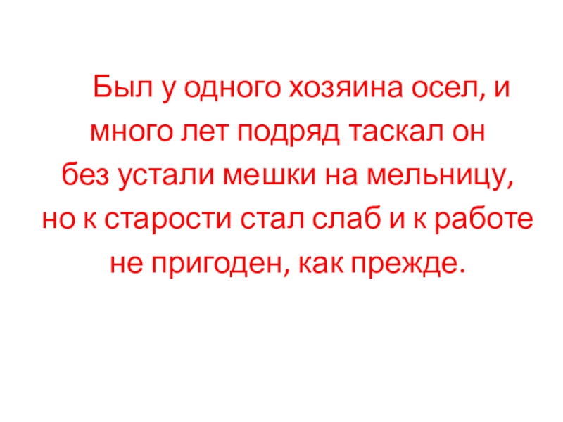 Был у одного хозяина осел, имного лет подряд таскал он без устали мешки на мельницу,но к старости