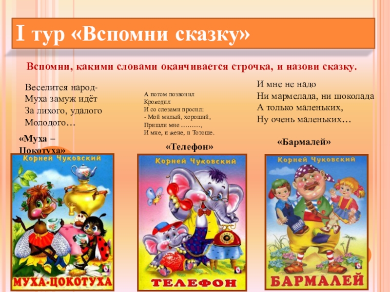Вспомни, какими словами оканчивается строчка, и назови сказку.