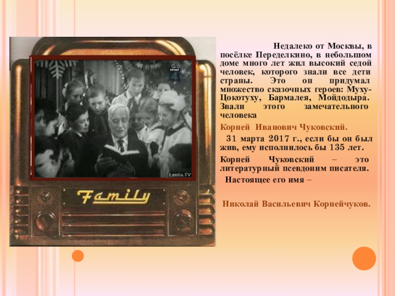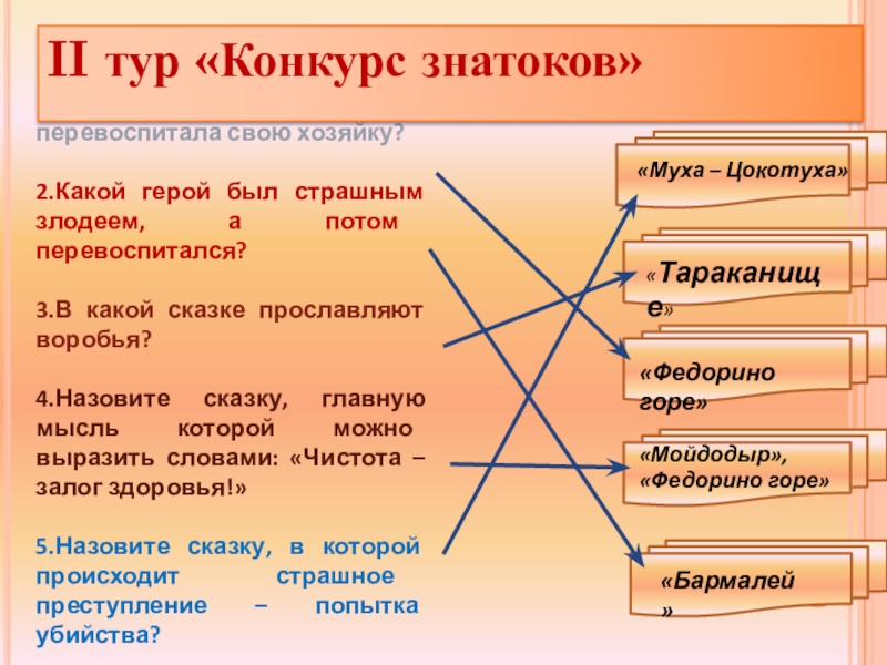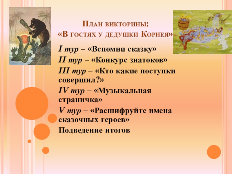 «Путаница», «Тарканище», «Мойдодыр», «Телефон», «Бармалей», «Краденое солнце», «Крокодил»