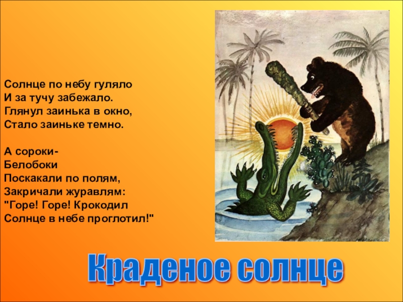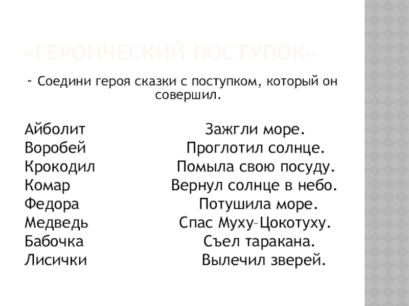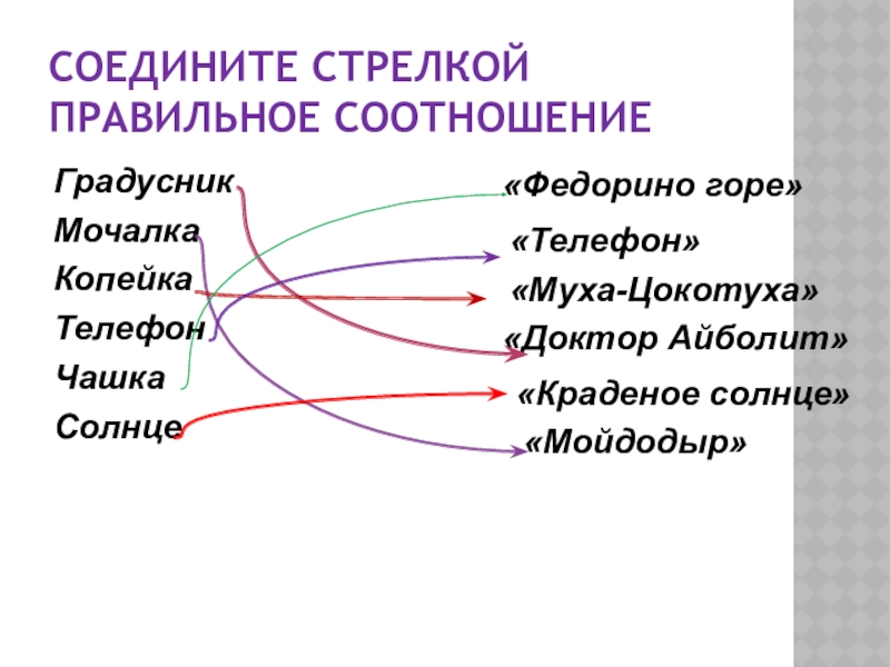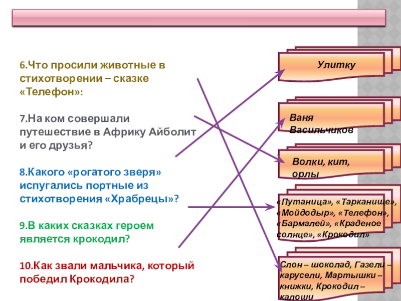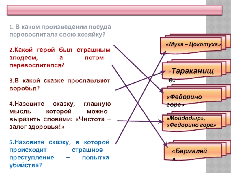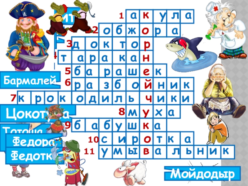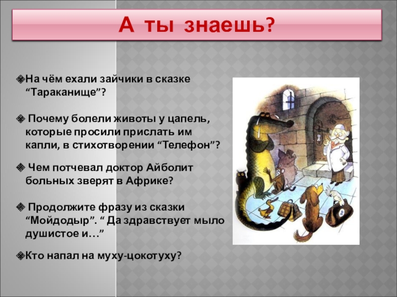 «Путаница», «Тарканище», «Мойдодыр», «Телефон», «Бармалей», «Краденое солнце», «Крокодил»