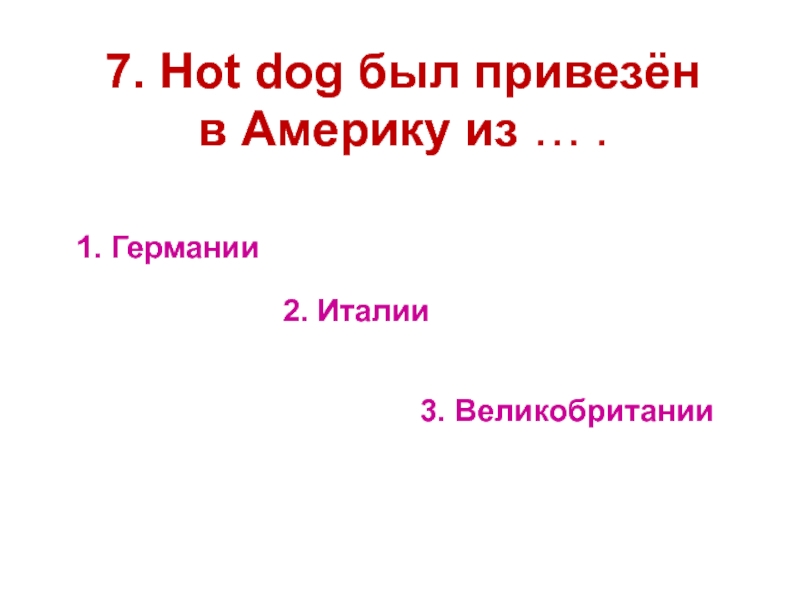 1. Германии2. Италии3. Великобритании7. Hot dog был привезён в Америку из … .