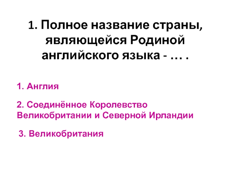 1. Полное название страны, являющейся Родиной английского языка - … . 1. Англия 2. Соединённое Королевство Великобритании