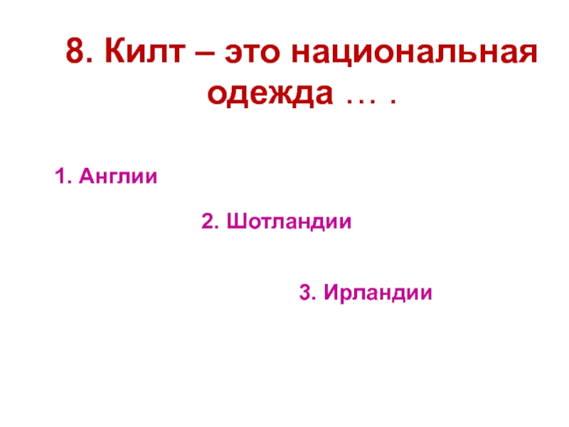 1. Англии3. Ирландии8. Килт – это национальная одежда … .2. Шотландии
