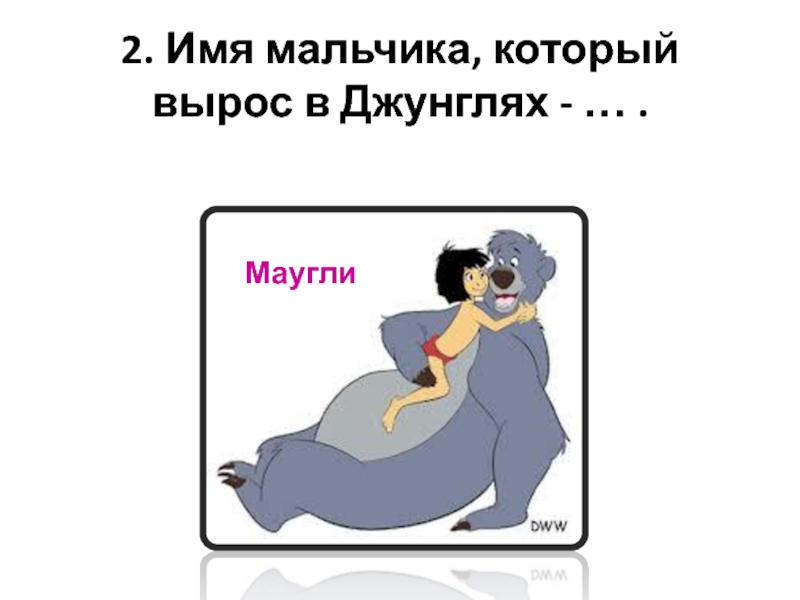2. Имя мальчика, который вырос в Джунглях - … .Маугли