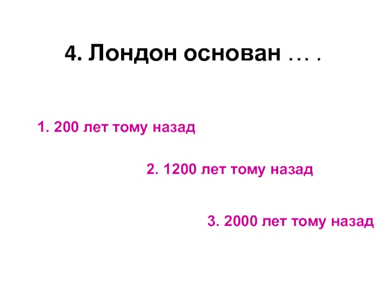 4. Лондон основан … .1. 200 лет тому назад2. 1200 лет тому назад3. 2000 лет тому назад